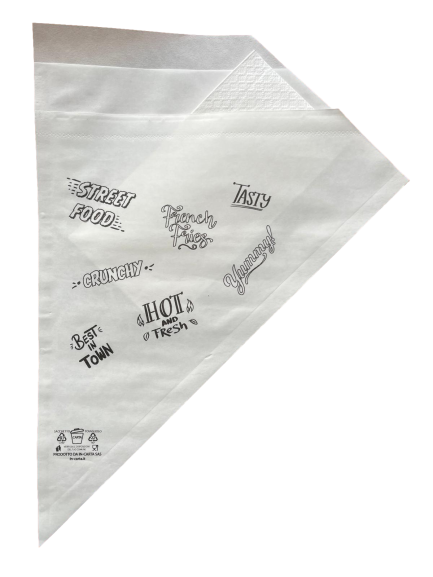 Portapanino lungo, stampa slang, carta bianca politenata, pz. 200, con tovagliolo 30×30 piegato 1/8, resistente all’unto e ideale per panini, piadine, focacce, pizza, fritti e molto altro.